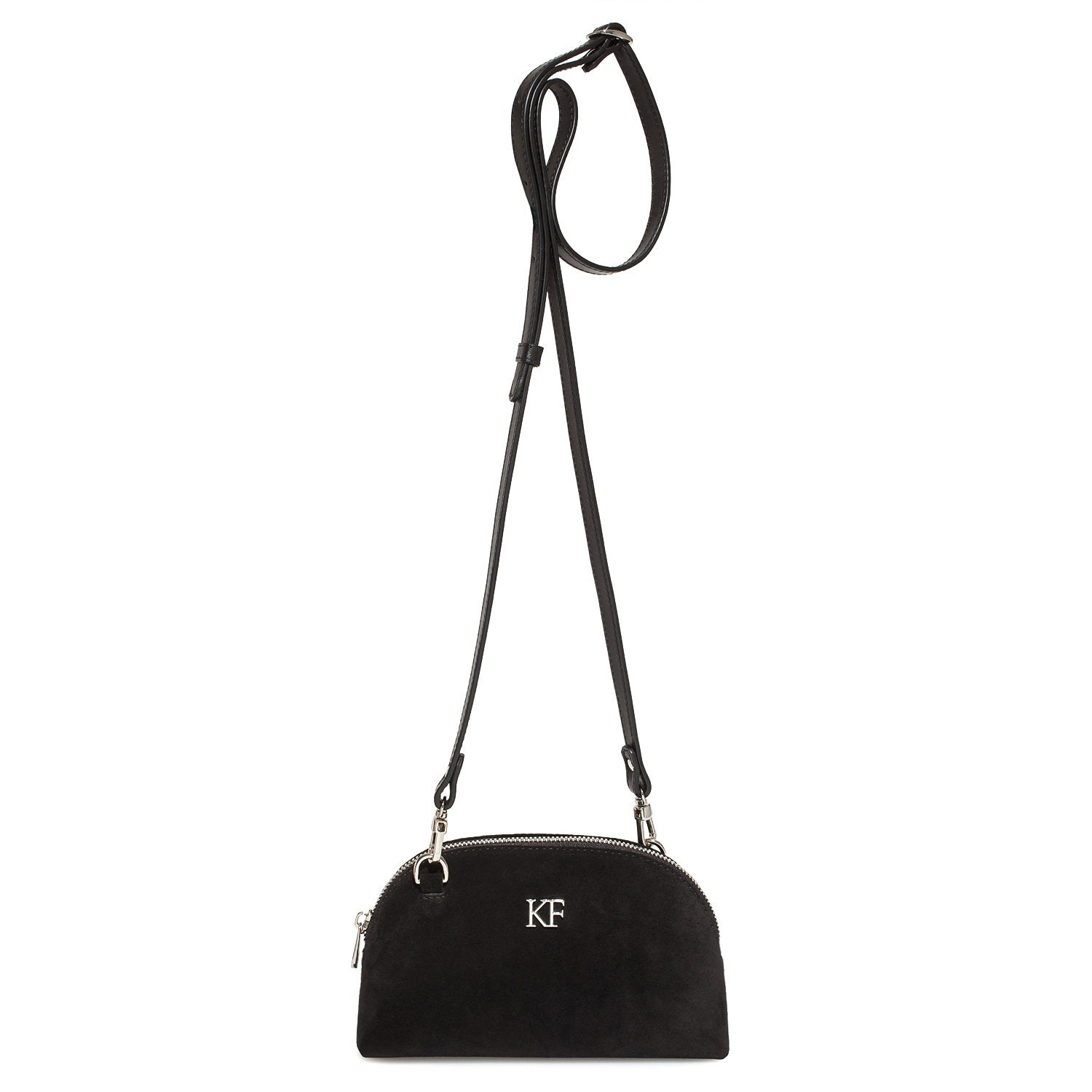 Black genuine suede leather woman crossbody bag from ukrainian designer Katerina Fox. Fashionable and elegant modern bag KF for bright girls and women. This bag is able to attract attention and highlight your exquisite taste. The internal space of a cosmetic bag is equipped with one spacious compartment and one patch-pocket. The bag is closed with a zipper. The kit also includes a storage bag. The kit also includes a storage bag.
